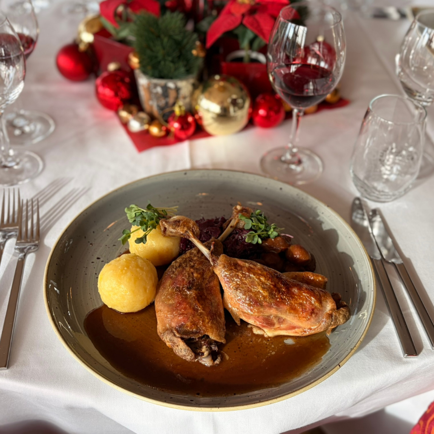 Entenkeulen mit OrangenjusZwei Stück sous-vide gegarte Entenkeulen in feinem Orangenjus, dazu Apfelrotkohl, Maronen und Kartoffelklöße. |